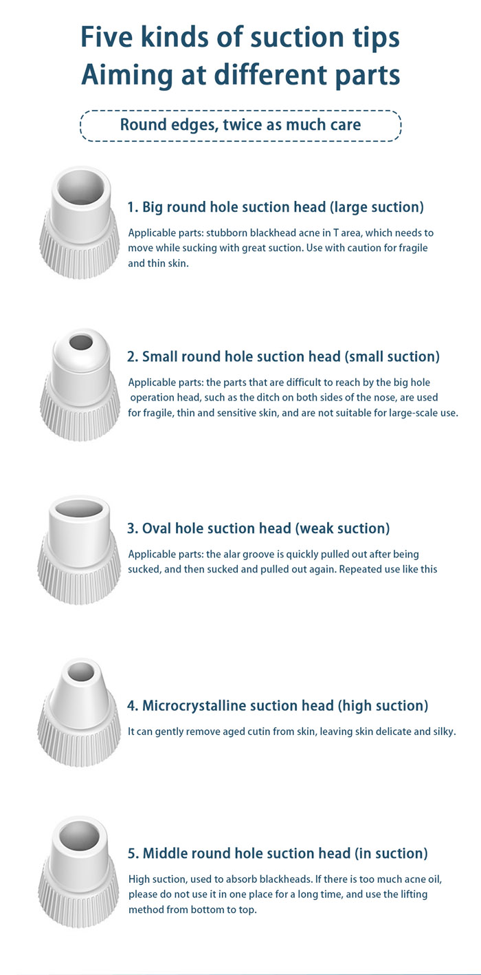Suction:Min -48 Kpa / Max -68 Kpa With 5 types of suction heads Battery capacity:500mAh Charge time:3H Use time:0.5H Mode: Dry:Dry and stybborn skin- Mild suction Neutral:Neutral sensitive skin- Moderate suction Oily:Oily mixed skin- Heavy suction ![]() ![]() ![]() ![]() ![]() ![]() ![]() ![]() ![]() ![]()